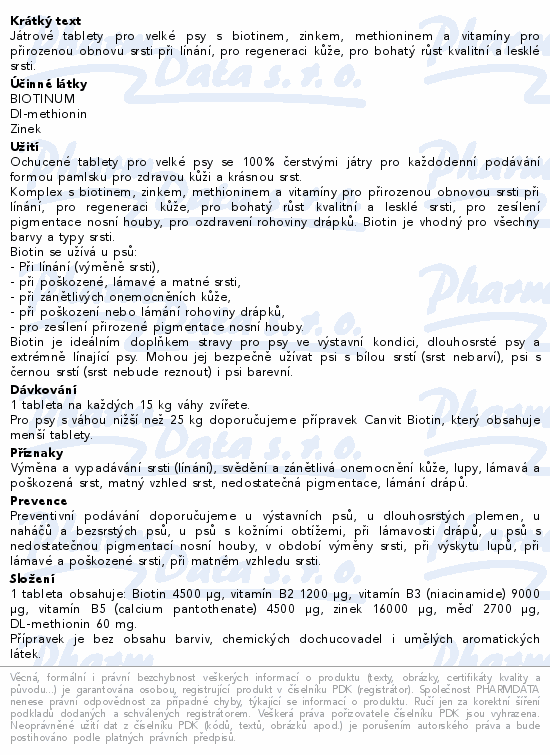 Játrové tablety pro velké psy s biotinem, zinkem, methioninem a vitamíny pro přirozenou obnovu srsti při línání, pro regeneraci kůže, pro bohatý růst kvalitní a lesklé srsti.