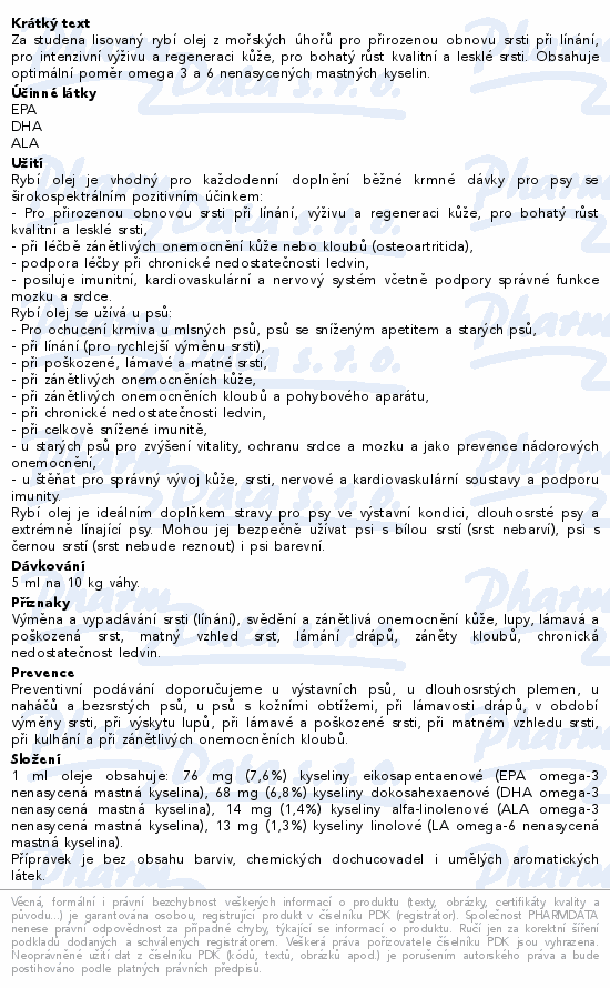 Za studena lisovaný rybí olej z mořských úhořů pro přirozenou obnovu srsti při línání, pro intenzivní výživu a regeneraci kůže, pro bohatý růst kvalitní a lesklé srsti. Obsahuje optimální poměr omega 3 a 6 nenasycených mastných kyselin.