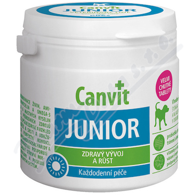 Canvit Junior pro zdravý vývoj a růst u štěňat a mladých psů s obsahem aminokyselin, pre a probiotik, vitamínů, minerálů a dalších esenciálních živin včetně 6 a 3 nenasycených mastných kyselin. Velmi chutné tablety pro každodenní podávání jako pamlsek.
