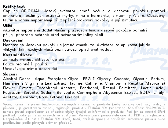 Capillan ORIGINAL vlasový aktivátor jemně pečuje o vlasovou pokožku pomocí anthenolu, rostlinných extraktů myrhy, vilínu a heřmánku, s vitamíny A a E. Obsažený taurin a kofein napomáhají při zlepšení prokrvení pokožky a její stimulaci.