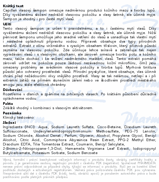 Capillan vlasový šampon omezuje nadměrnou produkci kožního mazu a tvorbu lupů. Díky vyváženému složení nedráždí vlasovou pokožku a vlasy šetrně, ale účinně myje. Šampon je vhodný i pro časté mytí vlasů.