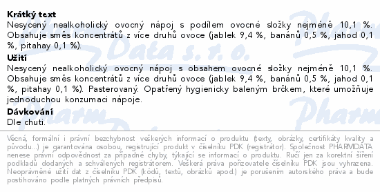 Nesycený nealkoholický ovocný nápoj s podílem ovocné složky nejméně 10,1 %. Obsahuje směs koncentrátů z více druhů ovoce (jablek 9,4 %, banánů 0,5 %, jahod 0,1 %, pitahay 0,1 %).