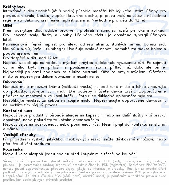 Intenzívně a dlouhodobě (až 8 hodin) působící masážní hřejivý krém. Velmi účinný pro povzbuzení svalů, kloubů, zlepšení krevního oběhu, přípravu svalů na zátěž a následnou regeneraci. Jako bonus hřejivá náplast zdarma. Nevhodné pro děti do 12 let.