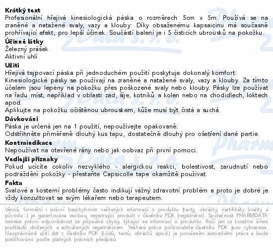 Profesionální hřejivá kinesiologická páska o rozměrech 5cm x 5m. Používá se na zraněné a natažené svaly, vazy a klouby: Díky obsaženému kapsaicinu má současně prohřívající efekt, pro lepší účinek. Součástí balení je i 5 čisticích ubrousků na pokožku.