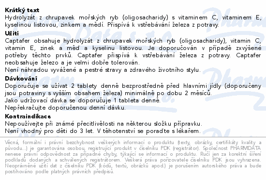 Hydrolyzát z chrupavek mořských ryb (oligosacharidy) s vitaminem C, vitaminem E, kyselinou listovou, zinkem a mědí. Přispívá k vstřebávání železa z potravy.