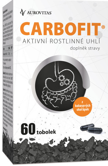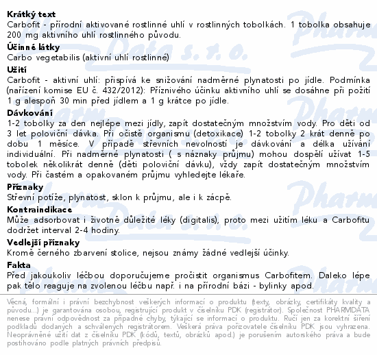 Carbofit - přírodní aktivované rostlinné uhlí v rostlinných tobolkách. 1 tobolka obsahuje 200 mg aktivního uhlí rostlinného původu.