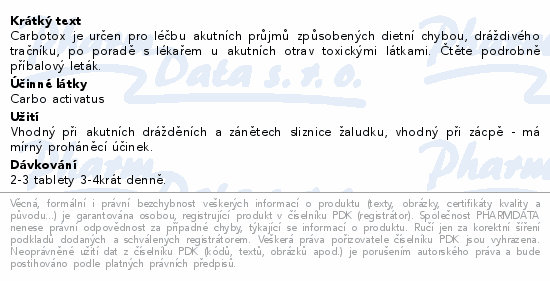 Carbotox je určen pro léčbu akutních průjmů způsobených dietní chybou, dráždivého tračníku, po poradě s lékařem u akutních otrav toxickými látkami. Čtěte pozorně příbalový leták.