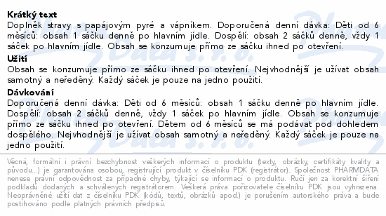 Doplněk stravy s papájovým pyré a vápníkem. Doporučená denní dávka: Děti od 6 měsíců: obsah 1 sáčku denně po hlavním jídle. Dospělí: obsah 2 sáčků denně, vždy 1 sáček po hlavním jídle. Obsah se konzumuje přímo ze sáčku ihned po otevření.