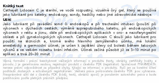 Cathejell Lidocain C je sterilní, ve vodě rozpustný, vizuálně čirý gel, který se používá jako lubrikant pro katetry, endoskopy, sondy, hadičky nebo jiné zdravotnické nástroje.