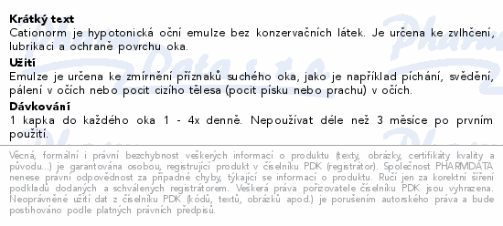 Cationorm je hypotonická oční emulze bez konzervačních látek. Je určena ke zvlhčení, lubrikaci a ochraně povrchu oka.