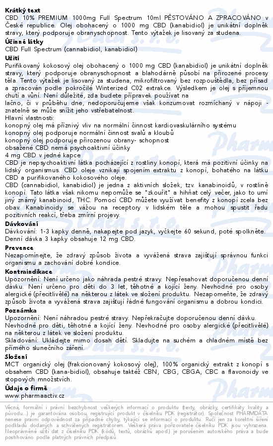 CBD 10% PREMIUM 1000mg Full Spectrum 10ml PĚSTOVÁNO A ZPRACOVÁNO v České republice. Olej obohacený o 1000 mg CBD (kanabidiol) je unikátní doplněk stravy, který podporuje obranyschopnost. Tento výtažek je lisovaný za studena.