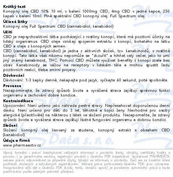 Konopný olej CBD 10% 10 ml, v balení 1000mg CBD, 4mg CBD v jedné kapce, 250 kapek v balení 10ml. Plně spektrální CBD konopný olej. Full Spectrum olej.