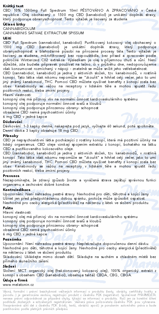 CBD 10% 1500mg Full Spectrum 10ml PĚSTOVÁNO A ZPRACOVÁNO v České republice. Olej obohacený o 1500 mg CBD (kanabidiol) je unikátní doplněk stravy, který podporuje obranyschopnost. Tento výtažek je lisovaný za studena.