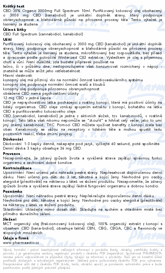 CBD 30% Organic 3000mg Full Spectrum 10ml. Purifikovaný kokosový olej obohacený o 3000 mg CBD (kanabidiol) je unikátní doplněk stravy, který podporuje obranyschopnost a blahodárně působí na přirozené procesy těla. Tento výtažek je lisovaný za studena.