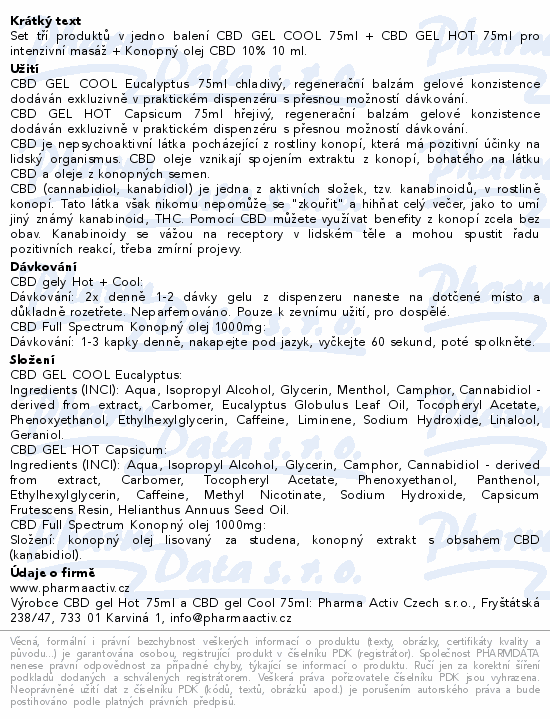 Set tří produktů v jedno balení CBD GEL COOL 75ml + CBD GEL HOT 75ml pro intenzivní masáž + Konopný olej CBD 10% 10 ml.