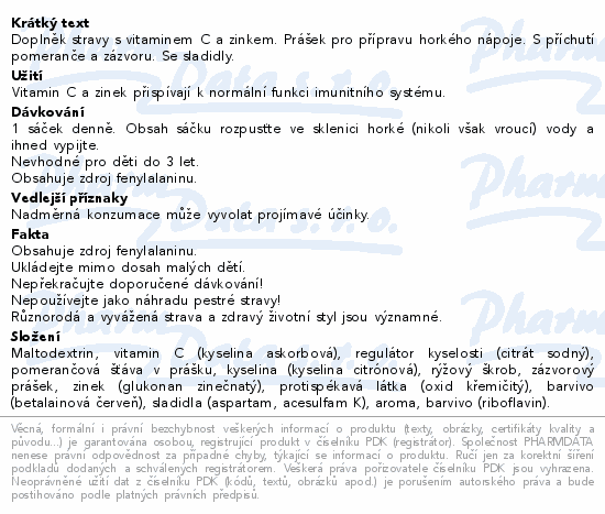 Doplněk stravy s vitaminem C a zinkem. Prášek pro přípravu horkého nápoje. S příchutí pomeranče a zázvoru. Se sladidly.