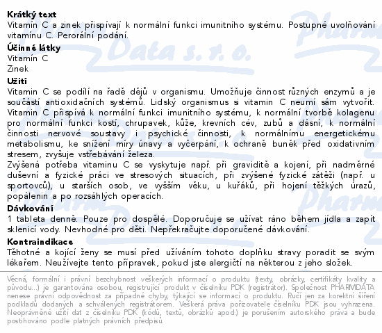 Vitamín C a zinek přispívají k normální funkci imunitního systému. Postupné uvolňování vitamínu C. Perorální podání.