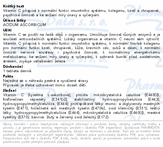 Vitamín C přispívá k normální funkci imunitního systému, kolagenu, kostí a chrupavek, psychické činnosti a ke snížení míry únavy a vyčerpání.