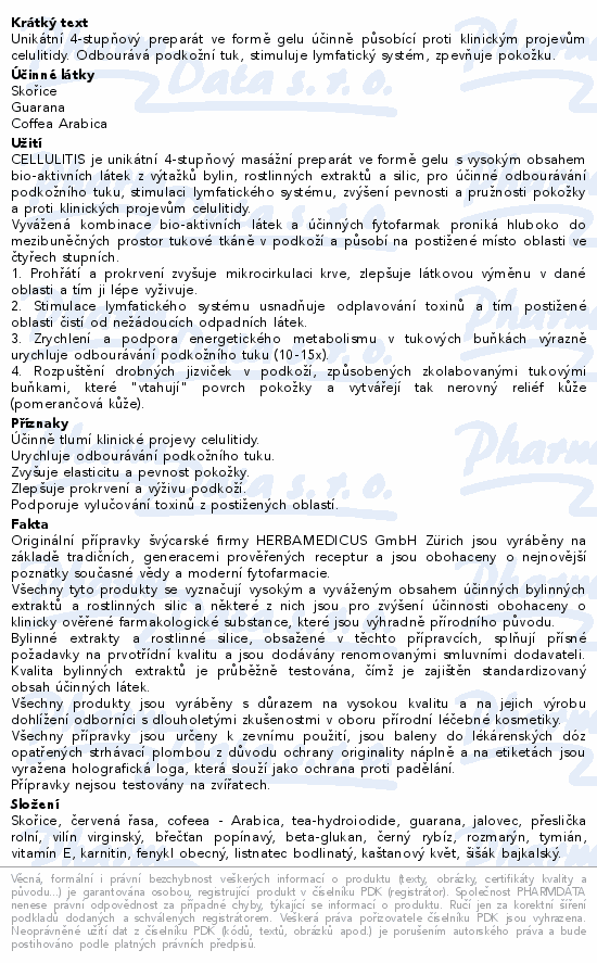 Unikátní 4-stupňový preparát ve formě gelu účinně působící proti klinickým projevům celulitidy. Odbourává podkožní tuk, stimuluje lymfatický systém, zpevňuje pokožku.
