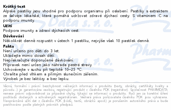 Alpské pastilky jsou vhodné pro podporu organismu při oslabení. Pastilky s extraktem ze šalvěje lékařské, která pomáhá udržovat zdravé dýchací cesty. S vitaminem C na podporu imunity.
