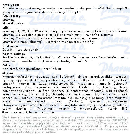 Doplněk stravy s vitamíny, minerály a stopovými prvky pro dospělé. Tento doplněk stravy není určen jako náhrada pestré stravy. Bez lepku.