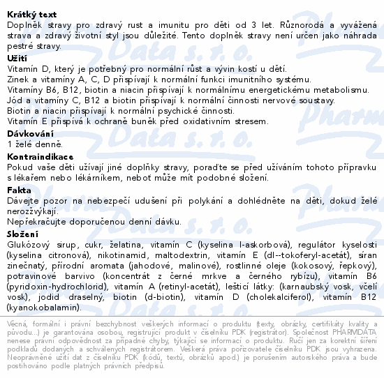 Doplněk stravy pro zdravý rust a imunitu pro děti od 3 let. Různorodá a vyvážená strava a zdravý životní styl jsou důležité. Tento doplněk stravy není určen jako náhrada pestré stravy.