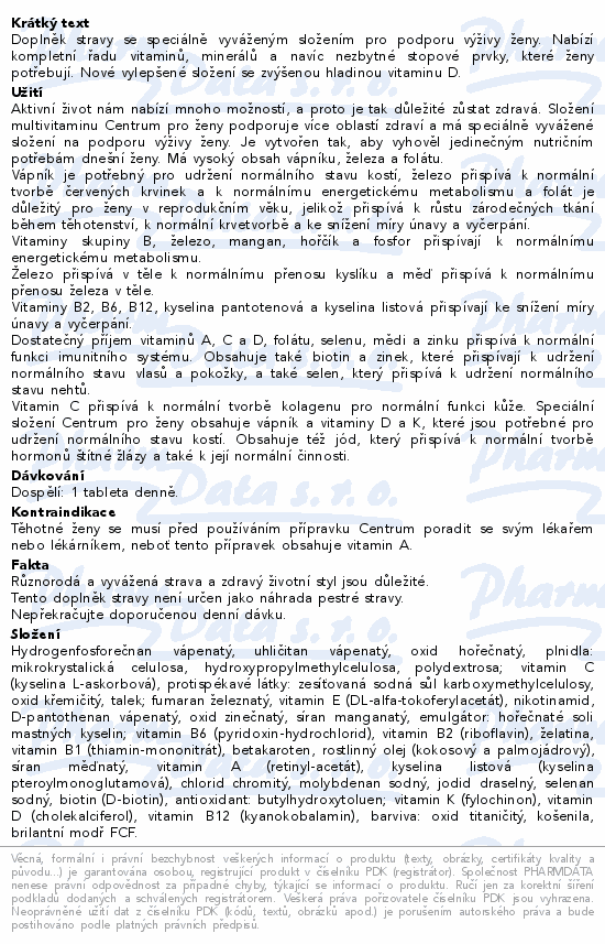 Doplněk stravy se speciálně vyváženým složením pro podporu výživy ženy. Nabízí kompletní řadu vitaminů, minerálů a navíc nezbytné stopové prvky, které ženy potřebují. Nové vylepšené složení se zvýšenou hladinou vitaminu D.