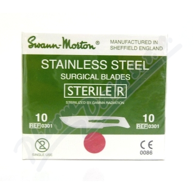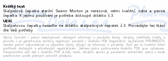 Skalpelová čepelka sterilní Swann Morton je nerezová, velmi kvalitní, ostrá a pevná čepelka. K jejímu používání je potřeba dokoupit držátko č.3.
