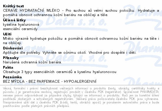 CERAVE HYDRATAČNÍ MLÉKO - Pro suchou až velmi suchou pokožku. Hydratuje a pomáhá obnovit ochrannou kožní bariéru na obličeji a těle.
