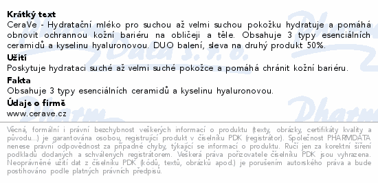 CeraVe - Hydratační mléko pro suchou až velmi suchou pokožku hydratuje a pomáhá obnovit ochrannou kožní bariéru na obličeji a těle. Obsahuje 3 typy esenciálních ceramidů a kyselinu hyaluronovou. DUO balení, sleva na druhý produkt 50%.
