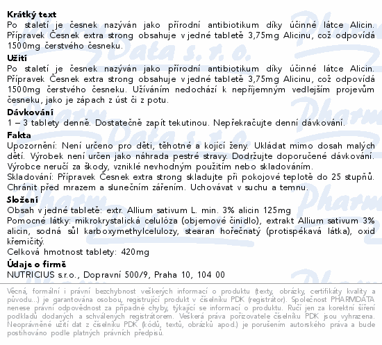 Po staletí je česnek nazýván jako přírodní antibiotikum díky účinné látce Alicin. Přípravek Česnek extra strong obsahuje v jedné tabletě 3,75mg Alicinu, což odpovídá 1500mg čerstvého česneku.