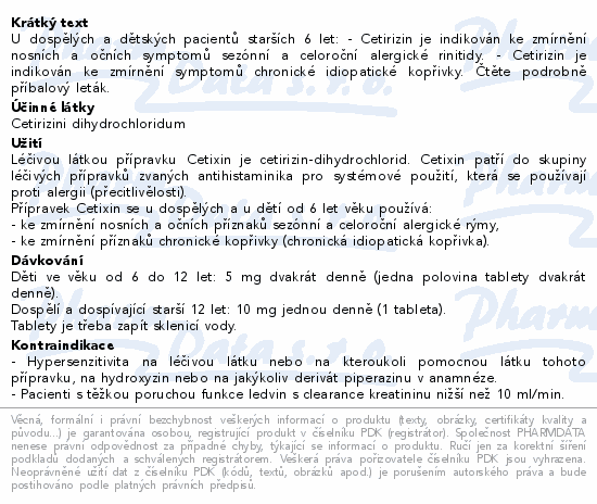 U dospělých a dětských pacientů starších 6 let: - Cetirizin je indikován ke zmírnění nosních a očních symptomů sezónní a celoroční alergické rinitidy. - Cetirizin je indikován ke zmírnění symptomů chronické idiopatické kopřivky. Čtěte pozorně příbalový leták.