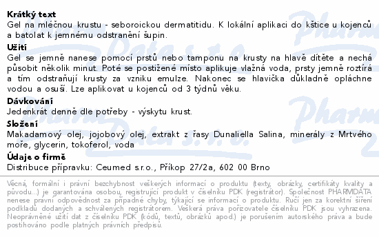 Gel na mléčnou krustu - seboroickou dermatitidu. K lokální aplikaci do kštice u kojenců a batolat k jemnému odstranění šupin.