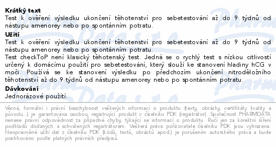 Test k ověření výsledku ukončení těhotenství pro sebetestování až do 9 týdnů od nástupu amenorey nebo po spontánním potratu.