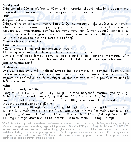 Chia semínka 500 g Wolfberry. Vždy s nimi vyrobíte chutné koktejly a pudinky pro celou rodinu. Chia semínka promění váš pokrm v něco nového.