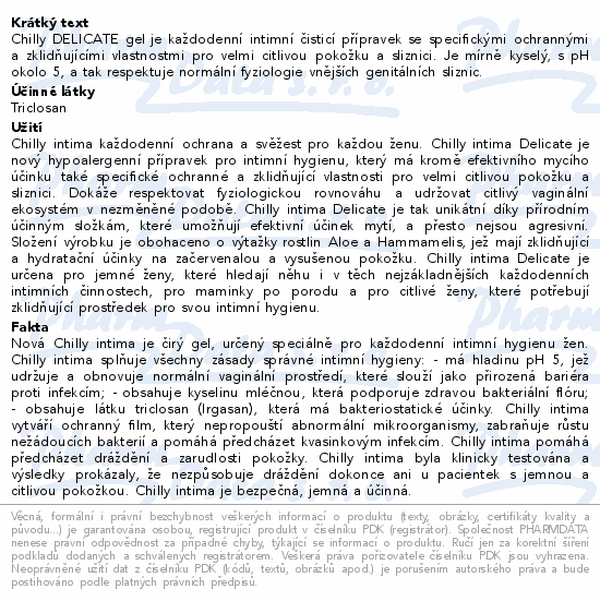 Chilly DELICATE gel je každodenní intimní čisticí přípravek se specifickými ochrannými a zklidňujícími vlastnostmi pro velmi citlivou pokožku a sliznici. Je mírně kyselý, s pH okolo 5, a tak respektuje normální fyziologie vnějších genitálních sliznic.