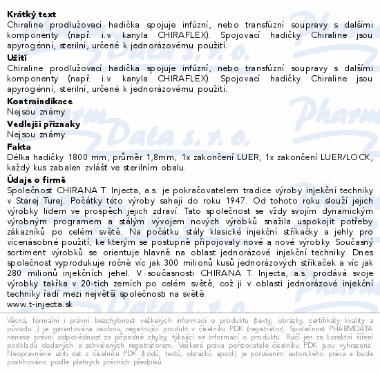 Chiraline prodlužovací hadička spojuje infúzní, nebo transfúzní soupravy s dalšími komponenty (např. i.v. kanyla CHIRAFLEX). Spojovací hadičky Chiraline jsou apyrogénní, sterilní, určené k jednorázovému použití.