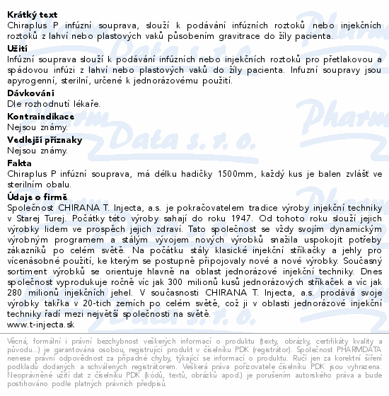 Chiraplus P infúzní souprava, slouží k podávání infúzních roztoků nebo injekčních roztoků z lahví nebo plastových vaků působením gravitrace do žíly pacienta.