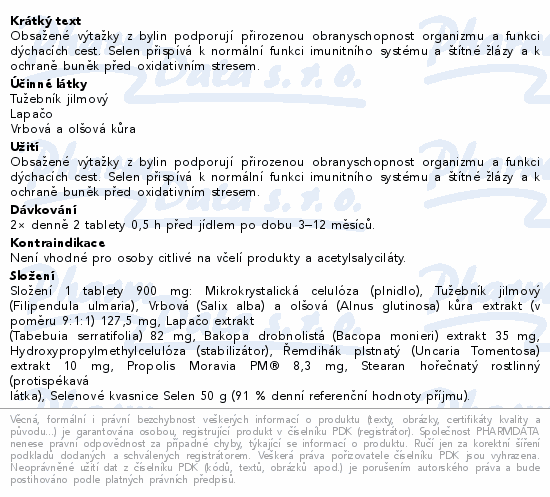 Obsažené výtažky z bylin podporují přirozenou obranyschopnost organizmu a funkci dýchacích cest. Selen přispívá k normální funkci imunitního systému a štítné žlázy a k ochraně buněk před oxidativním stresem.