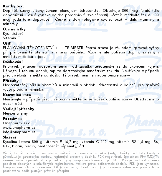 Doplněk stravy určený ženám plánujícím těhotenství. Obsahuje 800 mcg folátů (dle doporučení České gynekologicko-porodnické společnosti) včetně methylfolátu a 100 mcg jódu (dle doporučení České endokrinologické společnosti) + další vitamíny a minerály.