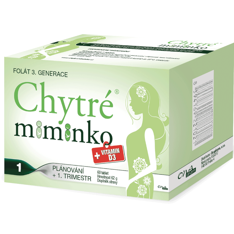 Přípravek Chytré miminko obsahuje 400 mcg kyseliny listové a 400 mcg metylfolátu, dále 250 mcg DHA, 100 mcg jódu, 20 mcg vitamínu D3.