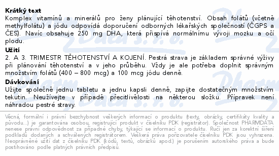 Komplex vitamínů a minerálů pro ženy plánující těhotenství. Obsah folátů (včetně methylfolátu) a jódu odpovídá doporučení odborných lékařských společností (ČGPS a ČES). Navíc obsahuje 250 mg DHA, která přispívá normálnímu vývoji mozku a očí plodu.