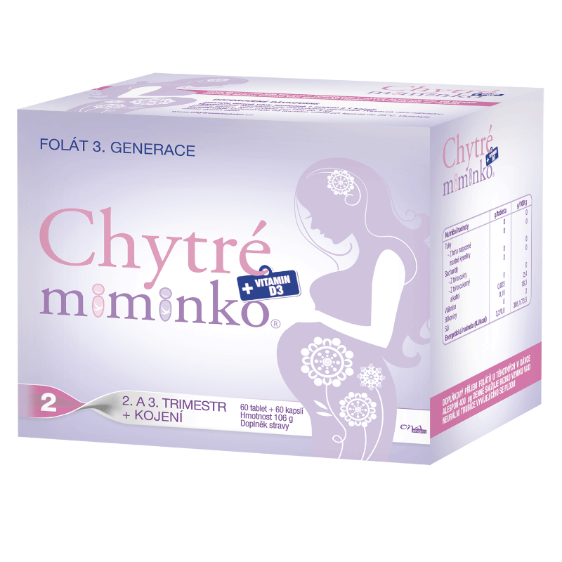 Přípravek Chytré miminko obsahuje 400 mcg kyseliny listové a 400 mcg metylfolátu, dále 250 mcg DHA, 100 mcg jódu, 20 mcg vitamínu D3.