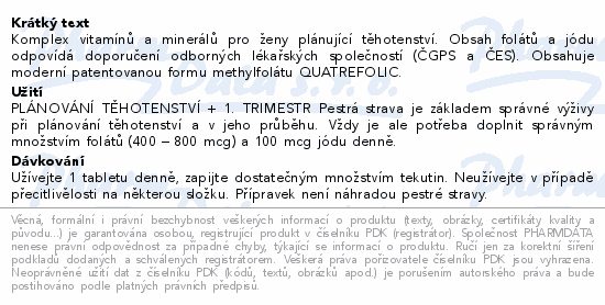 Komplex vitamínů a minerálů pro ženy plánující těhotenství. Obsah folátů a jódu odpovídá doporučení odborných lékařských společností (ČGPS a ČES). Obsahuje moderní patentovanou formu methylfolátu QUATREFOLIC.