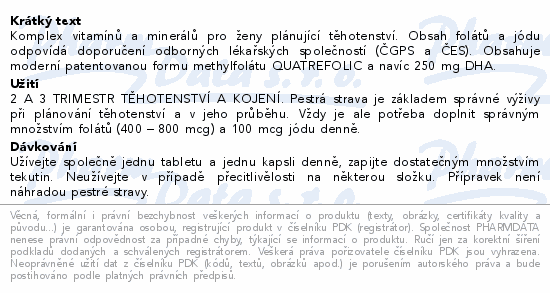 Komplex vitamínů a minerálů pro těhotné a kojící ženy. Obsah folátů (vč. methylfolátu) a jódu odpovídá doporučení odborných lékařských společností (ČGPS a ČES). Navíc obsahuje 250 mg DHA, která přispívá normálnímu vývoji mozku a očí plodu.