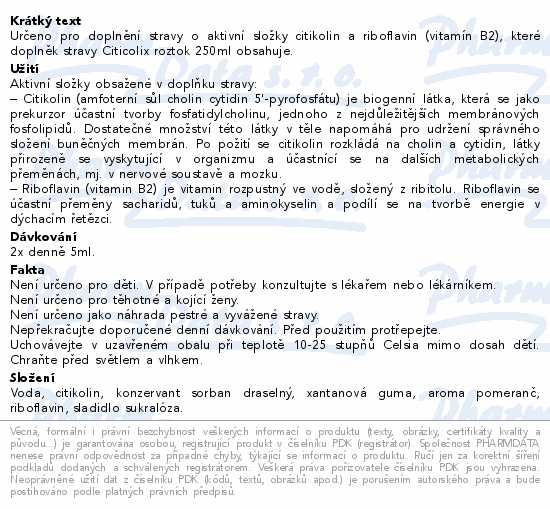 Určeno pro doplnění stravy o aktivní složky citikolin a riboflavin (vitamín B2), které doplněk stravy Citicolix roztok 250ml obsahuje.
