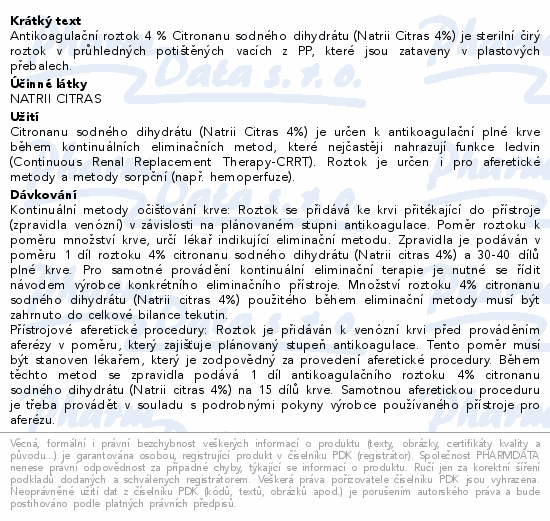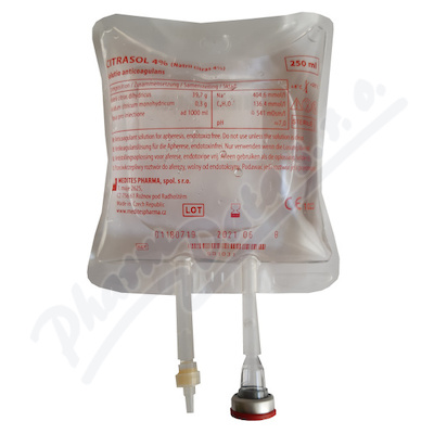 Antikoagulační roztok 4 % Citronanu sodného dihydrátu (Natrii Citras 4%) je sterilní čirý roztok v průhledných potištěných vacích z PP, které jsou zataveny v plastových přebalech.