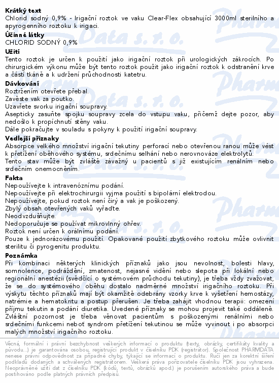 Chlorid sodný 0,9% - Irigační roztok ve vaku Clear-Flex obsahující 3000ml sterilního a apyrogenního roztoku k irigaci.