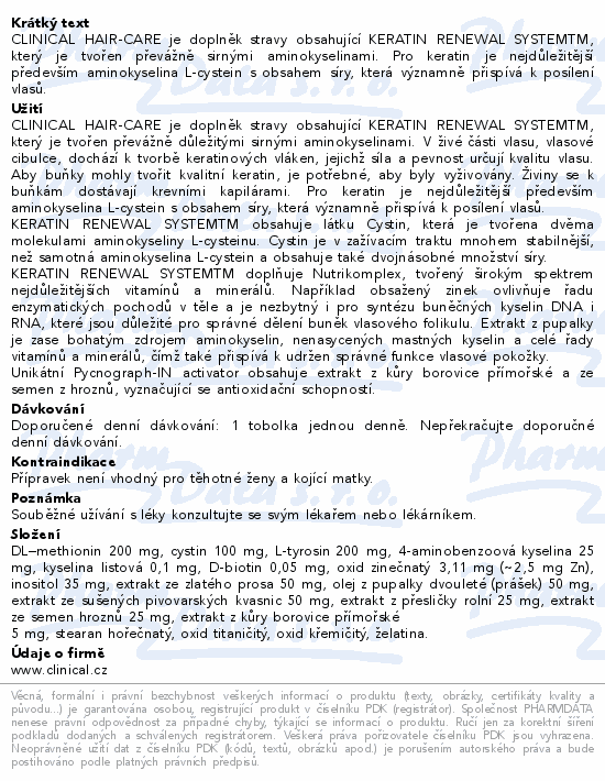 CLINICAL HAIR-CARE je doplněk stravy obsahující KERATIN RENEWAL SYSTEMTM, který je tvořen převážně sirnými aminokyselinami. Pro keratin je nejdůležitější především aminokyselina L-cystein s obsahem síry, která významně přispívá k posílení vlasů.