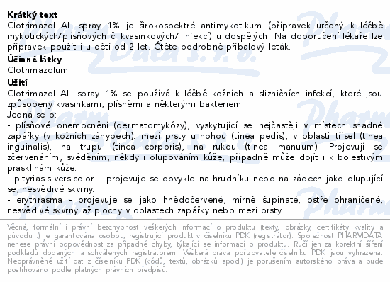 Clotrimazol AL spray 1% je širokospektré antimykotikum (přípravek určený k léčbě mykotických/plísňových či kvasinkových/ infekcí) u dospělých. Na doporučení lékaře lze přípravek použít i u dětí od 2 let. Čtěte pozorně příbalový leták.